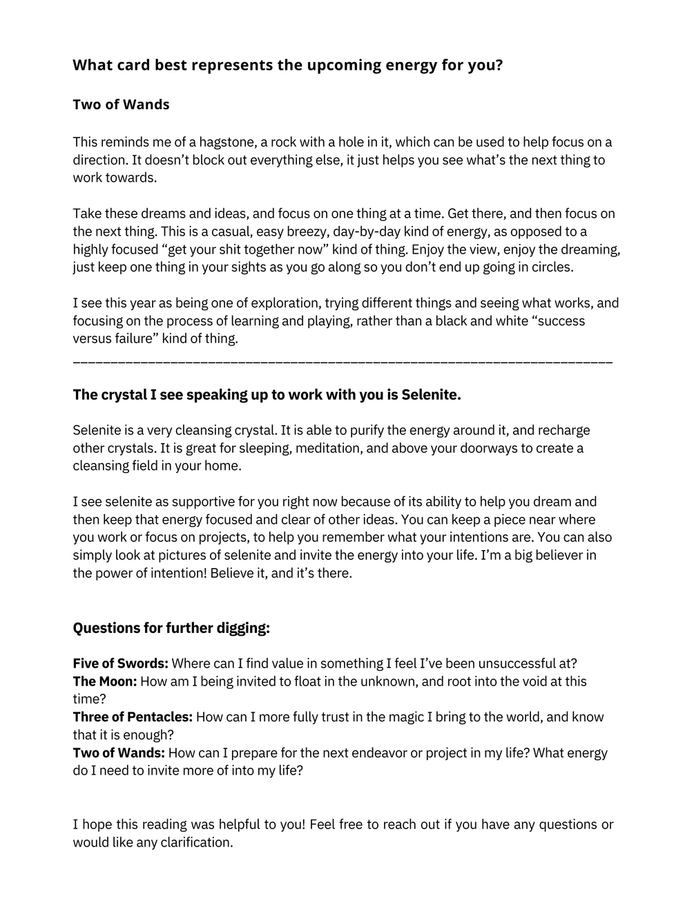 A pdf copy of my insights means you can refer back to the message anytime you need some more inspiration. I create this just for you! I've included a few example pages, most reports are 5 pages long.