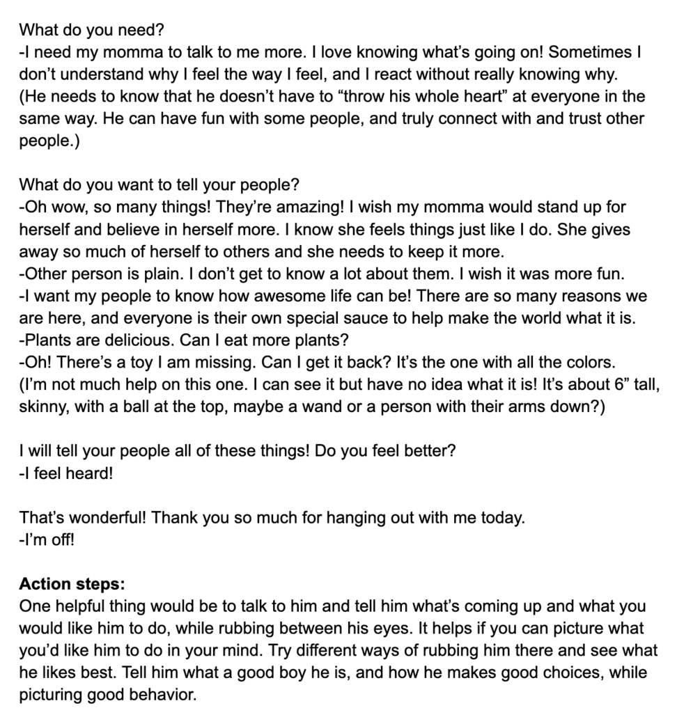 • Any questions you have for your companion. It usually works best to talk about 2 topics max, but you can ask multiple questions about the same topic. For example, if you want to know how they're feeling about a new addition to the family (one topic), ask How can I support you? What do you need? What do they do that makes you so angry? (three questions) If you need guidance on this, feel free to reach out to me anytime. Generally they're up for about 4-5 questions per topic before they wander off.