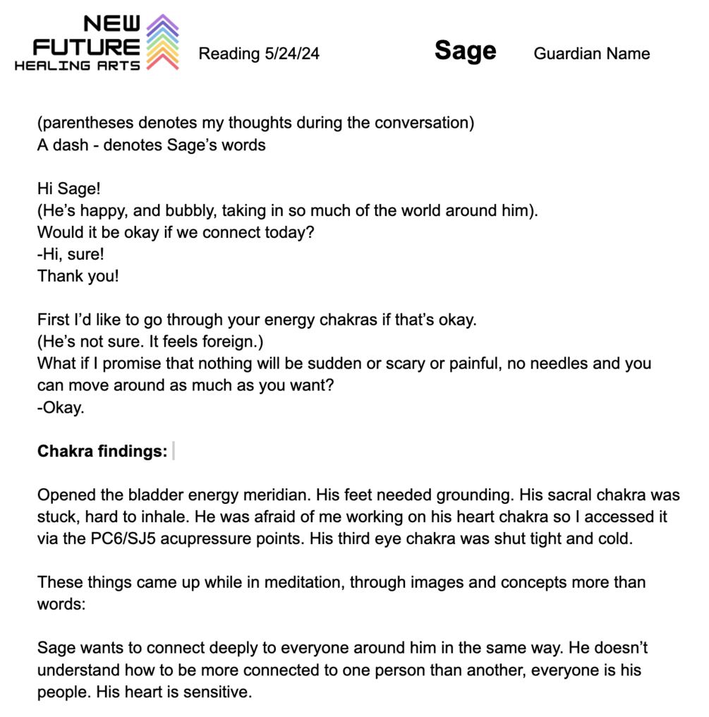 In the written report, I will include any additional messages that come up from your companion, as well as any insights that come up during the energy healing. These are usually things that are unspoken but come through as feelings to me.
