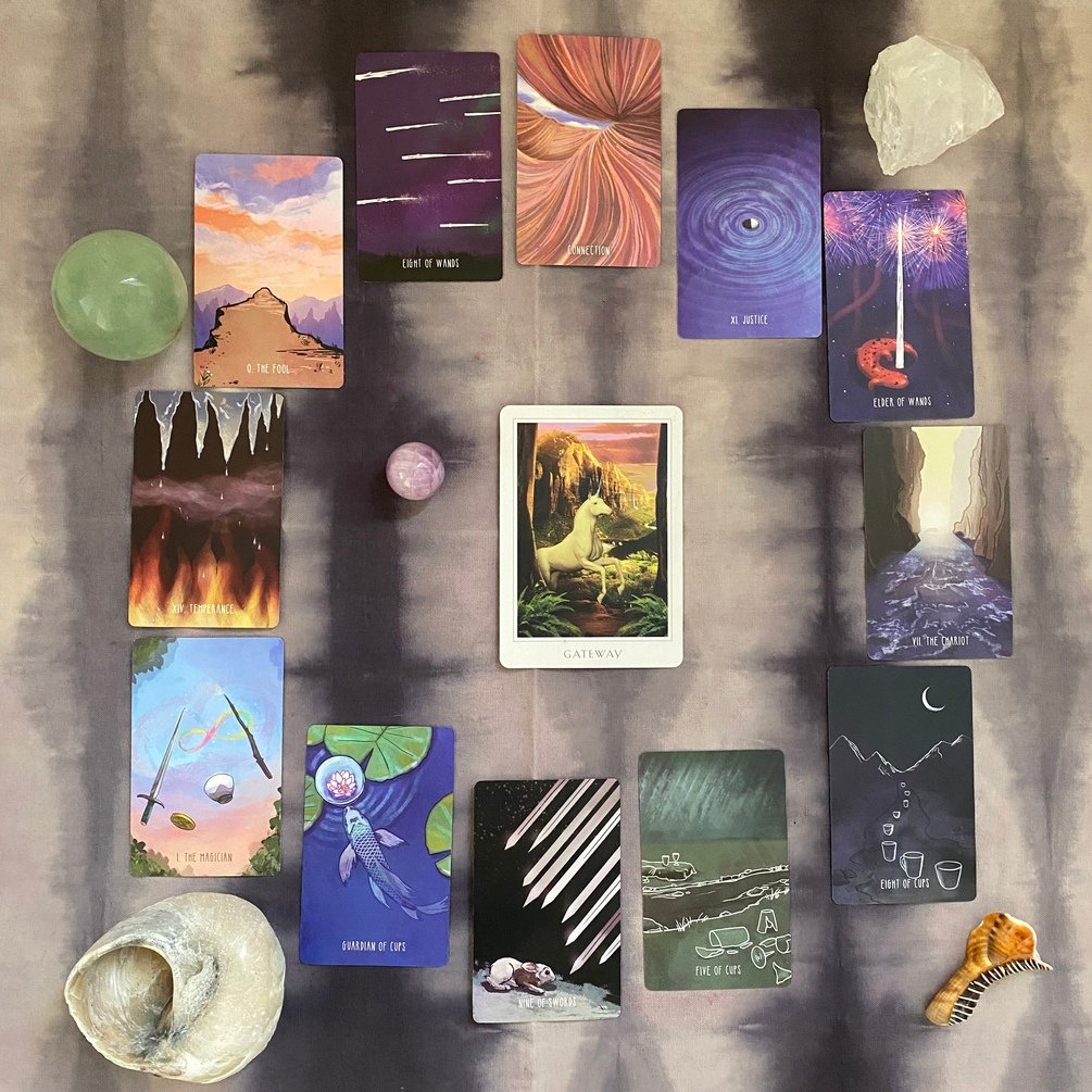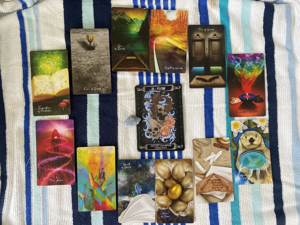My own 12+ card spread looks at the flow of the year to help you focus your energies. I help you move through the spiralic nature of life and make decisions to be your best self. Think of it like a piece of music: there is an ebb and flow to the energy, the volume, and the intensity. Going with the flow helps us to dance!